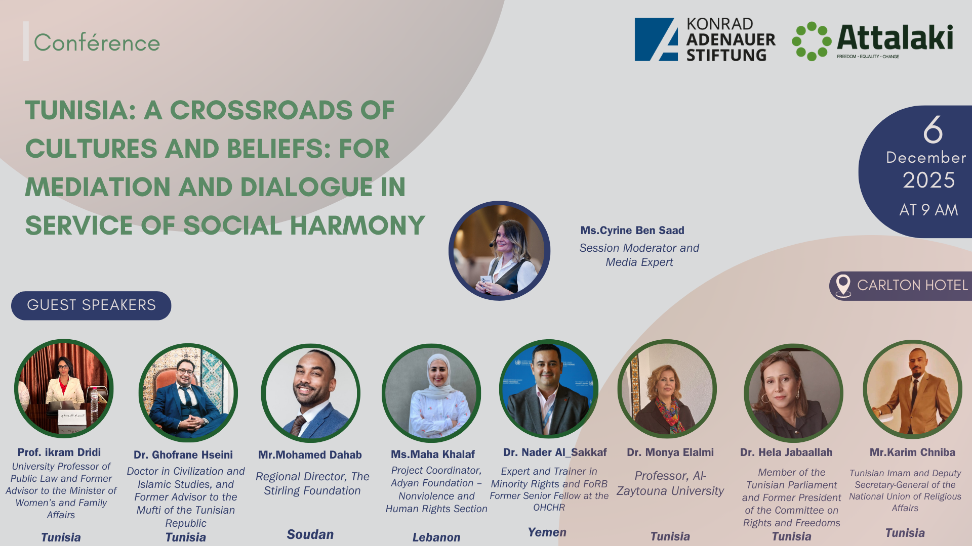 Attalaki Organization, in partnership with the Konrad Adenauer Foundation, is pleased to announce an upcoming two-day expert program to be held in Tunis, Tunisia, on 5–6 December, focusing on mediation, freedom of religion or belief (FoRB), and interfaith dialogue in the MENA region.